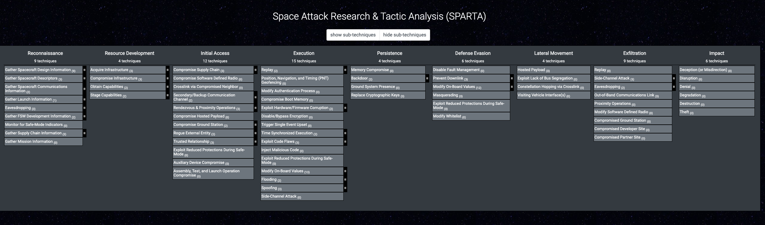 The relationship between tactics and techniques/sub-techniques can be visualized in the SPARTA Matrix below.